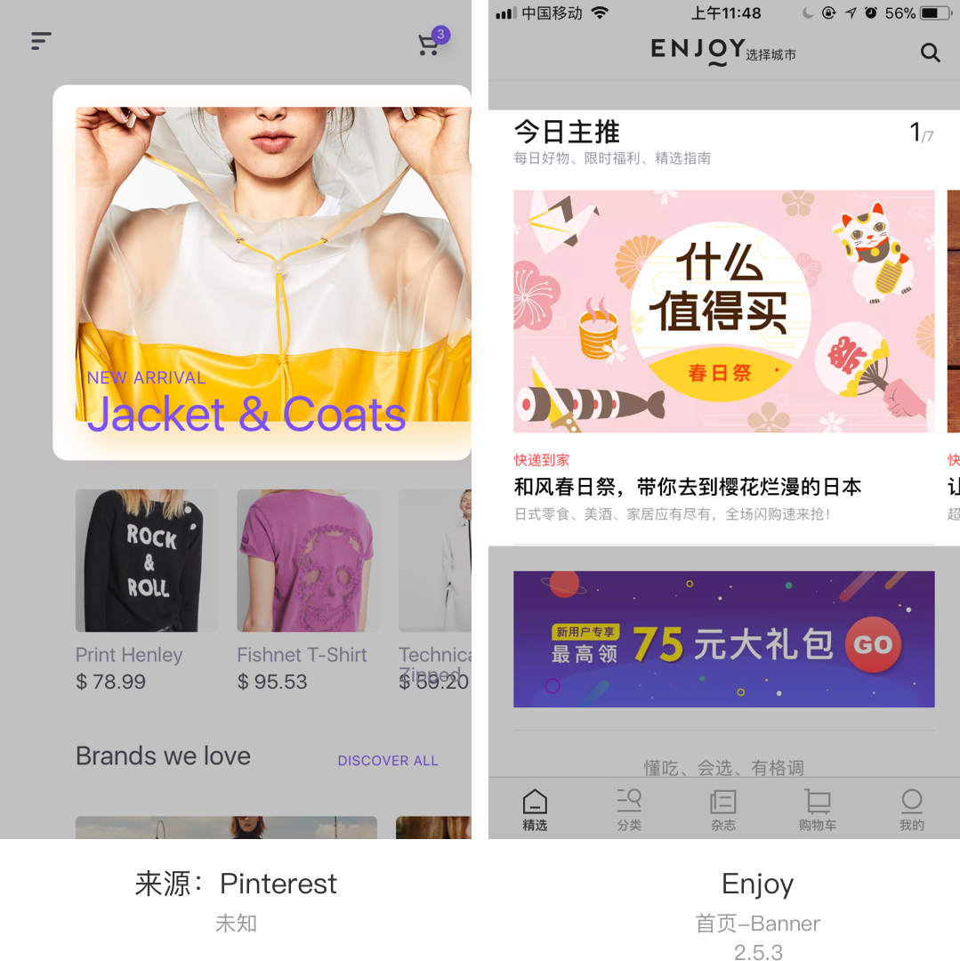 图文关联类一般适用于每个Banner都有一致性的文案和标签信息展示的时候使用,例如:电商类的Enjoy。