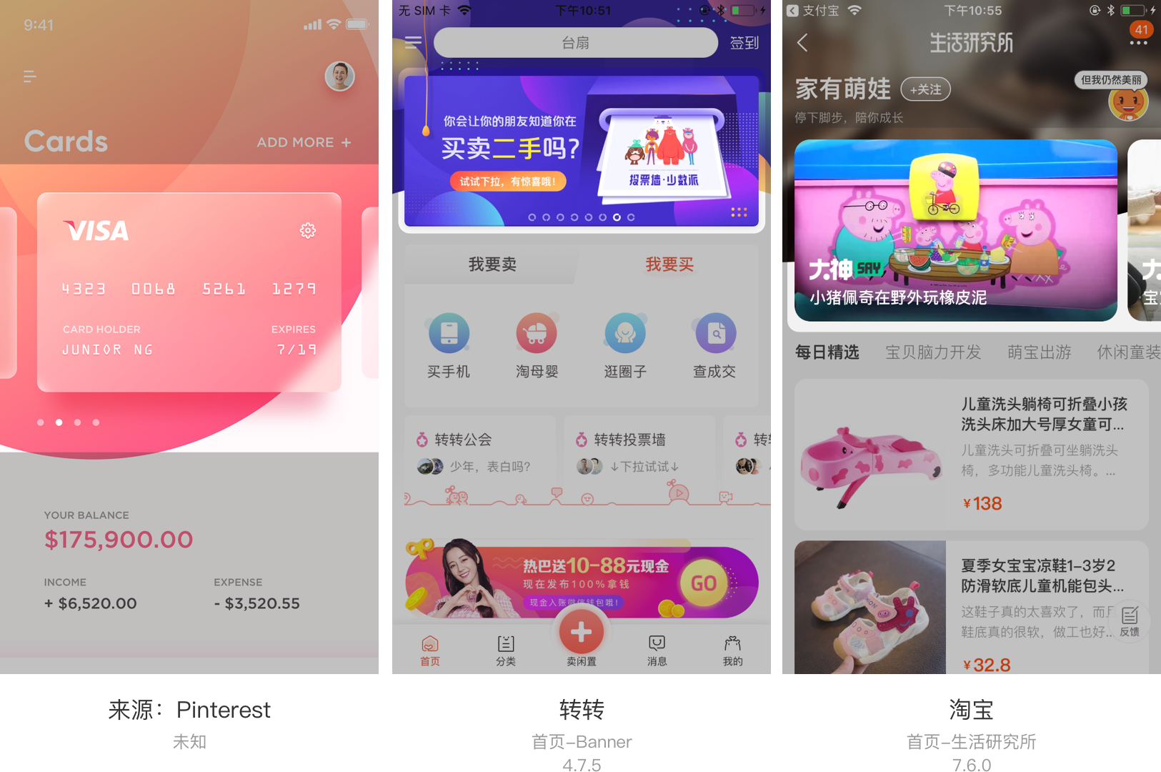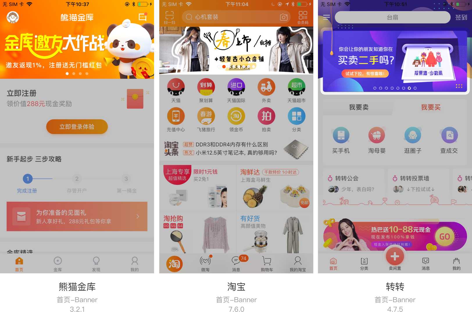其中熊猫金库采用的是全部撑满的样式,淘宝采用的是屏宽撑满的弧形样式,转转采用的是未撑满的样式。总的来说,单张切换样式主要用于首页Banner的展示。