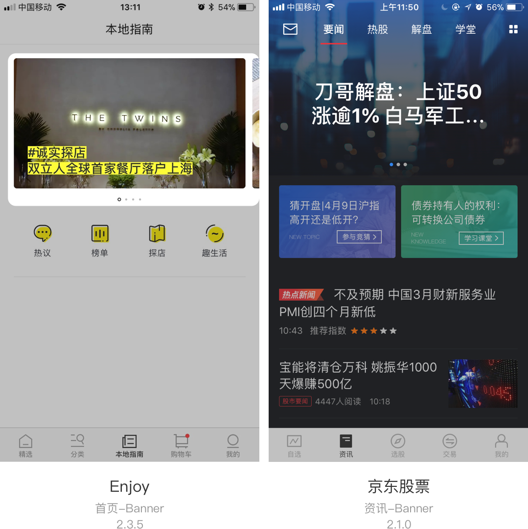 文本一致类多用于采用不同的图片作为背景,且图片上都有蒙层作为遮罩,每个不同的banner上的文字大小,排版都相同。例如:上图的京东股票和最后一张Enjoy的页面,这里的Enjoy的文本都添加了主色调作为文字底衬,更加强调了文字的一致性。