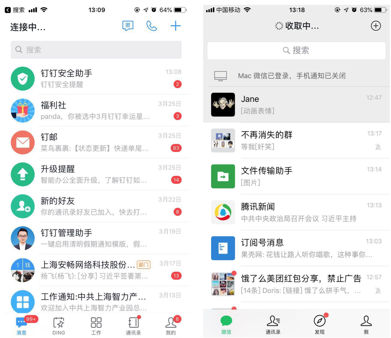 根据用户不同的使用场景,我们可以选择合适的交互等待形式来优化等待体验。例如:以微信、钉钉为代表的即时通讯工具,他们的消息列表中的内容都是采用顶部栏的加载方式,这样做的好处是消息内容的加载不会打扰到用户的操作,弱化了用户对加载等待的状态心理感知;