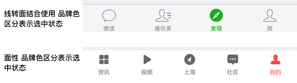 常用的是线性和面性两种,一般进行结合使用以表明选中状态;iOS 11之后面性icon开始流行,用品牌色进行区分;