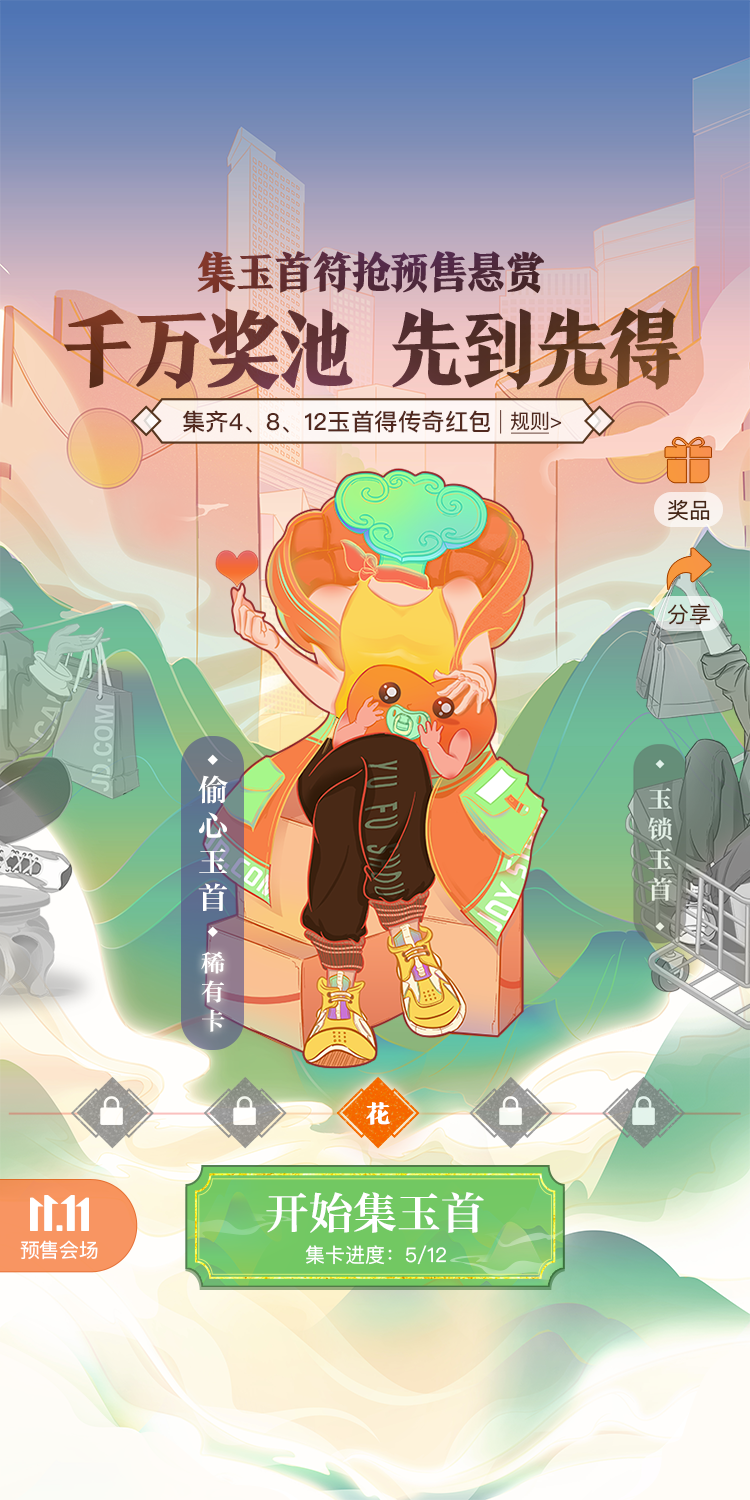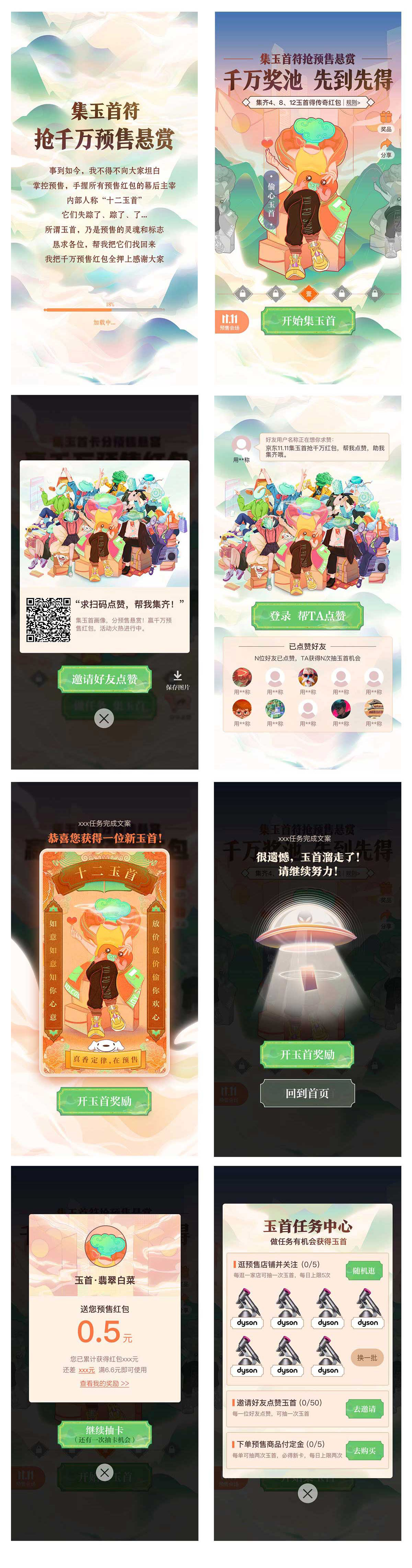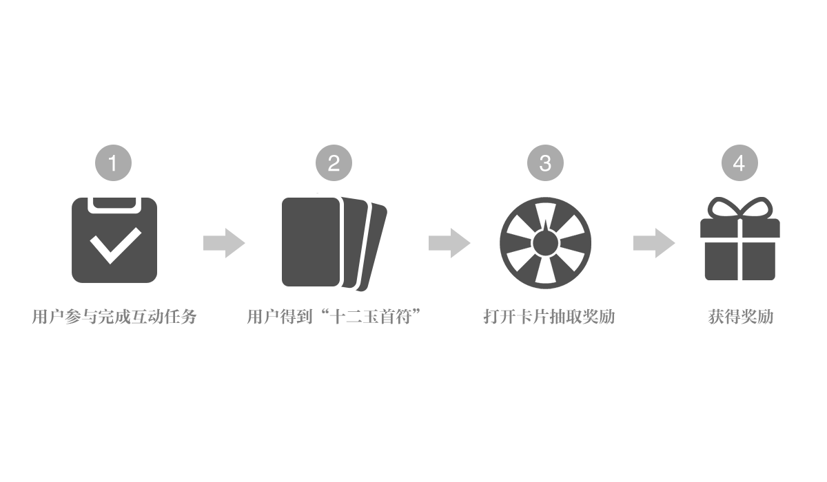 经历前面两次的概念迭代,坚持用与“预售”一词发音一致的方向不变,这个阶段的概念敲定为“十二玉首”,用户通过参与完成互动任务,收集“十二玉首符”卡片,打开卡片抽取奖励获得预售红包与优惠券——这是本次互动的基本互动逻辑。