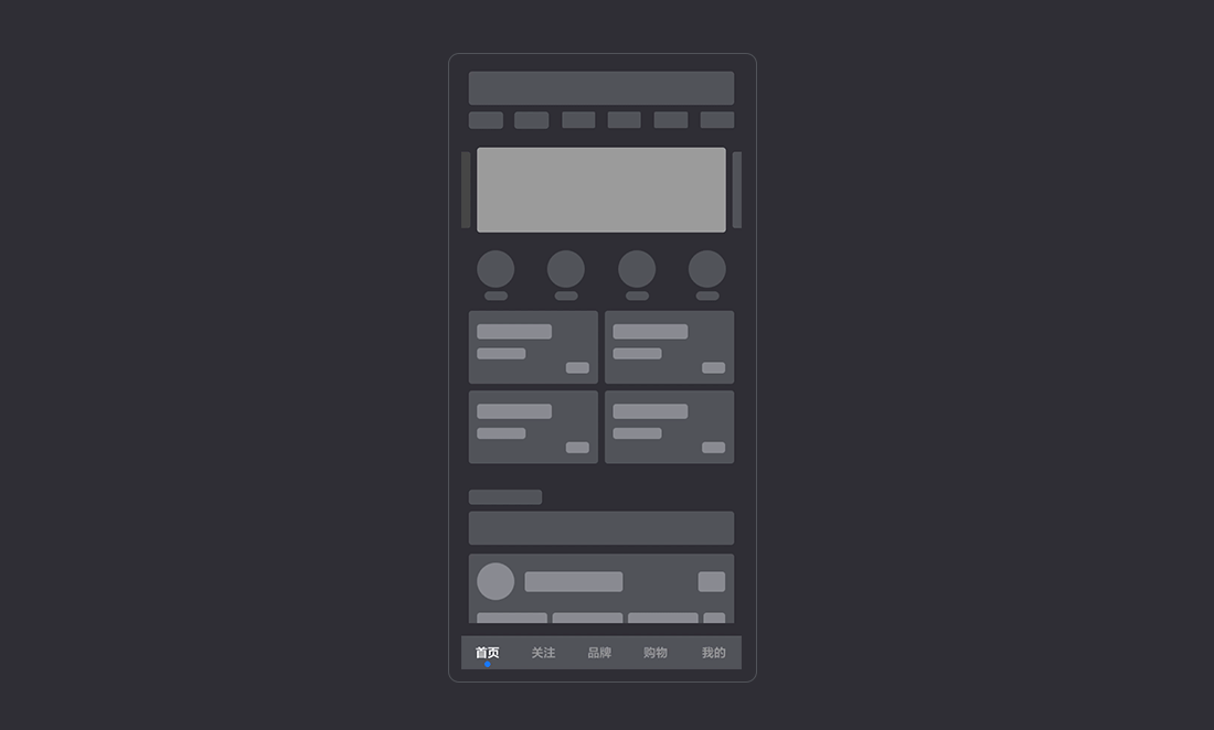 底部状态栏基本可以确定为:首页、关注、品牌、购物中心和个人中心。将关注放在首要位置主要是为了产品的日活,此处可将商场店铺每日的信息点做主要的传达展示,假设用户浏览到相应的产品,此时的动作即为店铺搜索或者购物中心寻找。