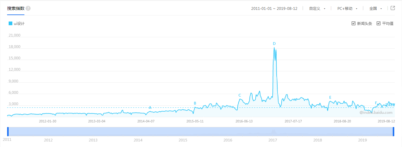UI设计师一直是IT行业最热门职位之一,因其薪资待遇较高,学习门槛较低而广受欢迎。在百度指数搜索“UI设计”来看,从2012年开始,UI设计的搜索呈明显上升趋势,尤其是在2016年左右出现“井喷式”增长。
