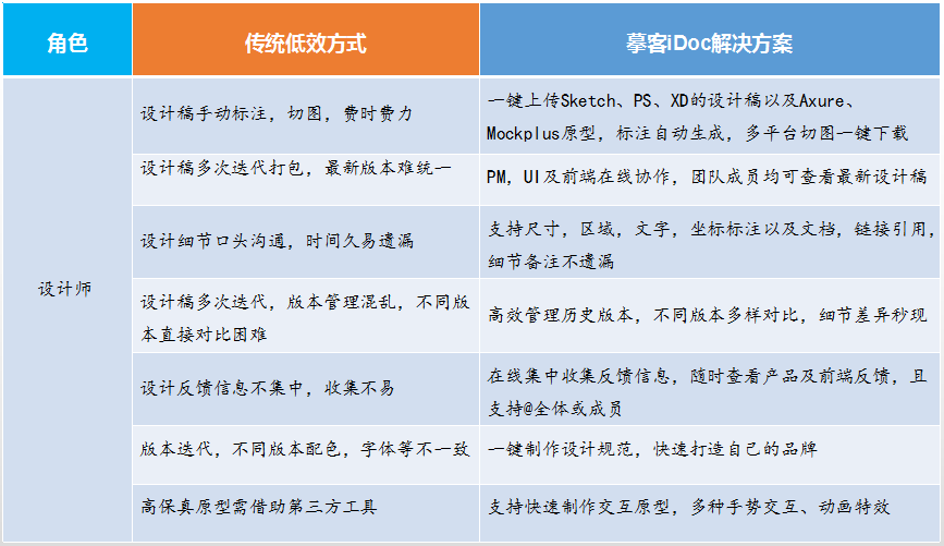 相信很多设计师都会在心里大骂,我是设计师,不是切图仔!到底什么时候才能摆脱这些密密麻麻的标注?到底什么时候才能摆脱熬夜,加班?好了,直到我发现了开发阶段的协同平台-摹客iDoc,UI设计师的春天来临了。那么,我们用一张表来看看,摹客iDoc能给设计师解决哪些烦恼?