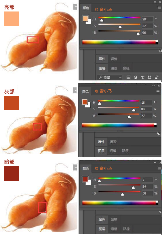 因此,看得出,胡萝卜的亮部暗部并不是非白即黑的。图上的胡萝卜的暗部也很透气,是因为暗部的饱和度也是很高的,并非加了很多黑。