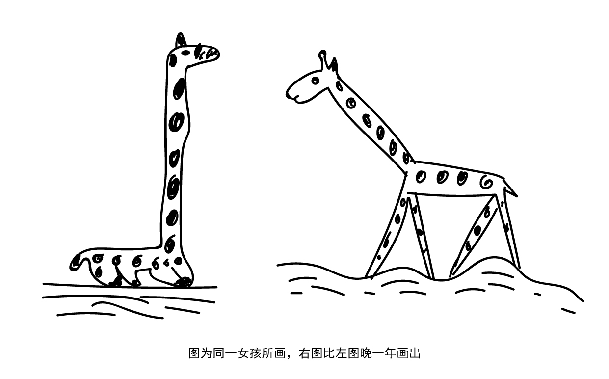 我们观察一副儿童早期阶段的画作,会发现从这幅画中我们几乎看不到任何具体形象,虽然他们技巧低劣、手法笨拙,但心目中仍然想要创造出一个与视觉投影酷似的形象。一般人都能注意到这样一件实事:当儿童处于某一年龄段时,如果要求他画自己的爸爸,他往往很少去观看站在他面前那个充当模特的爸爸。这一事实并不能说明儿童缺乏观察周围环境的能力,也不能说明儿童对自己周围的环境不感兴趣。儿童的这种行为只能说明:在儿童看来,新的信息对再现一个人的形象来说是不必要的,也是无用的。他们画的只是这个形象在他们视知觉经验中的样子。(这有点类似抽象画)当儿童发育到一定年龄时,就能毫不费力地区分出这个人和那个人之间的不同,并能注意到熟悉事物发生的微小变化,然而他们画出的画却仍然是一些对具体细节不加区分的一般性东西。