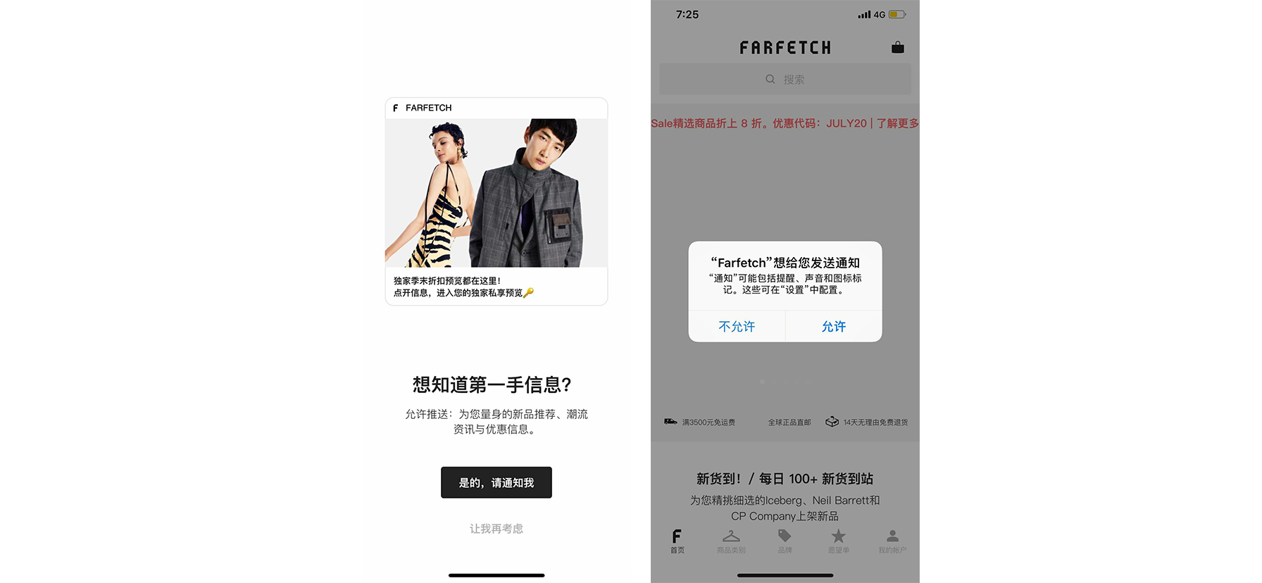 farfetch先是设计了一个打开APP push的特性说明页面,前置展示,主要用于说明允许APP push的价值,在用户允许之后才会展示原生的组件。