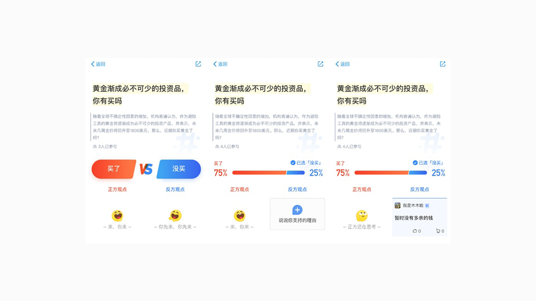 当只有一方有人表达观点,则另一方的emoji小人就会变成「正/反方还在思考」的样子和文案。有意思的文案设计,让原本严肃的理财话题也变得很有趣,还能起到引导用户行为刺激参与欲望的作用。