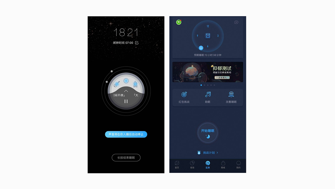 只要进入「蜗牛睡眠」的监测页面,点击「开始睡眠」就可以进入催眠界面了。按下播放键,系统会给用户播放助眠音乐,静谧滚动的界面形式能让人快速安静下来。进入助眠模式后会提示用户:声音将在你入睡后自动停止。这个功能设定十分人性化,产品强大的监测功能可以在用户入眠后自动判断是否需要关闭音乐。避免了用户在入眠后音乐继续长时间播放的困扰,也可以节省手机电池电量避免资源浪费。
