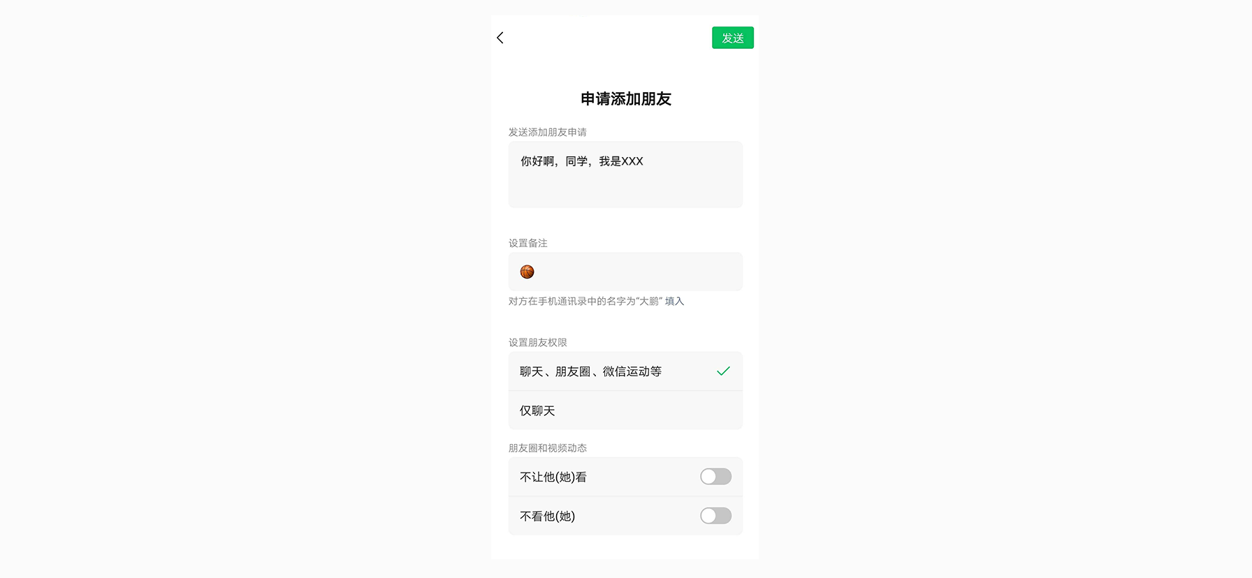 特别是在加人的时候,一个不小心是很容易误发出去的,这一层面出发,我觉得还是有优化的地方,如果能有一个备注的提示信息,这样体验会不会更好呢~~~
