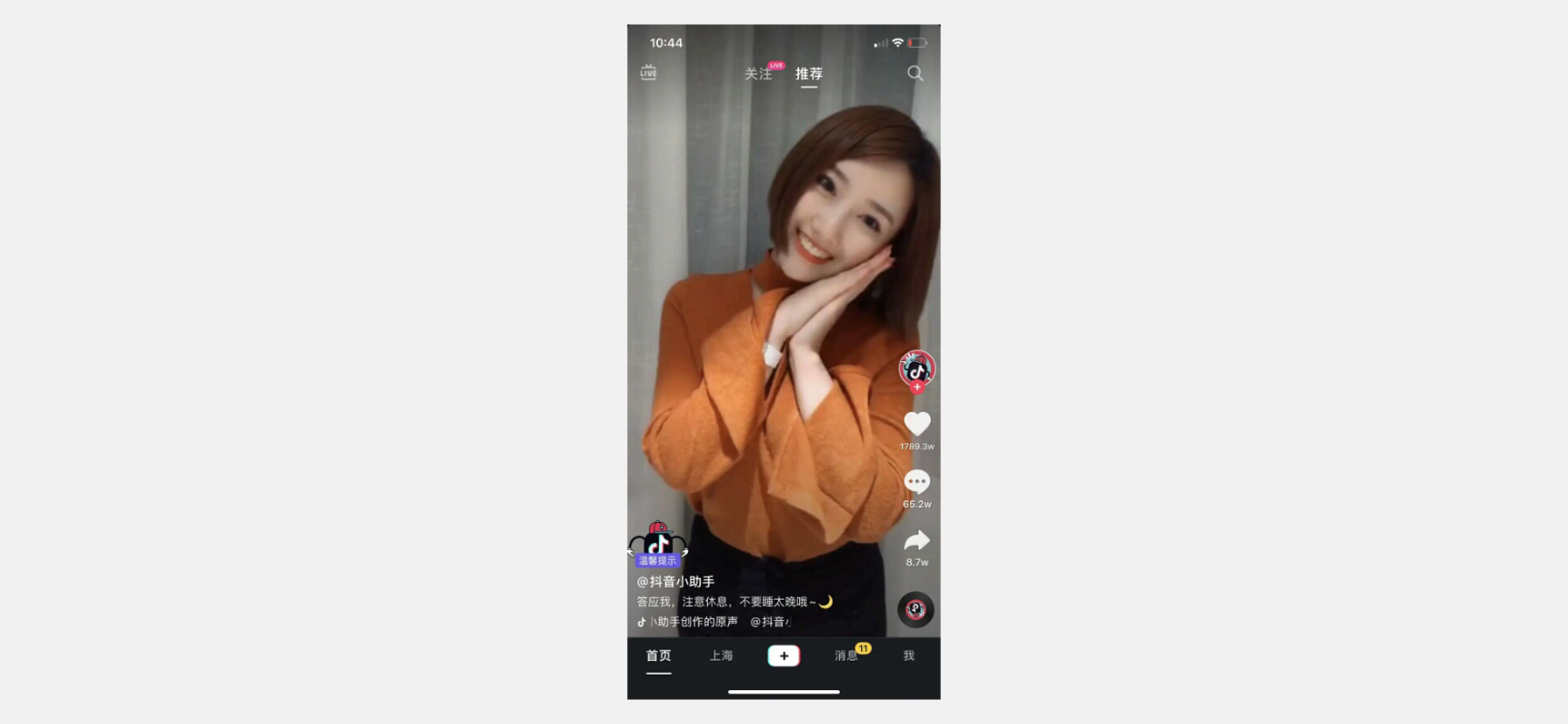 作为字节跳动推出的一个异常火爆的产品,抖音已经成为很多人当下生活中不可或缺的一种娱乐工具,包括我和身边的朋友都有在刷,疫情期间在家闲的慌,无意中刷抖音时就发现了这样一个细节,当你很晚了还在刷抖音的时候,抖音推荐流就会出现“注意休息,不要晚睡噢”的温馨提示,这个细节就做得很棒,还不会阻断用户体验,这个就像是你的男朋友在你耳边轻声说:“乖乖,睡觉了,很晚了对皮肤不好噢!” 这样的话,很有场景的设计,真的有很暖心。
