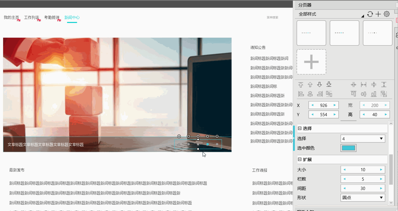 对于新闻中心页面设计来说,封面新闻都是其标配之一。在此款原型中,我们可以使用图片轮播组件,轻松实现封面新闻自动轮播的呈现效果。