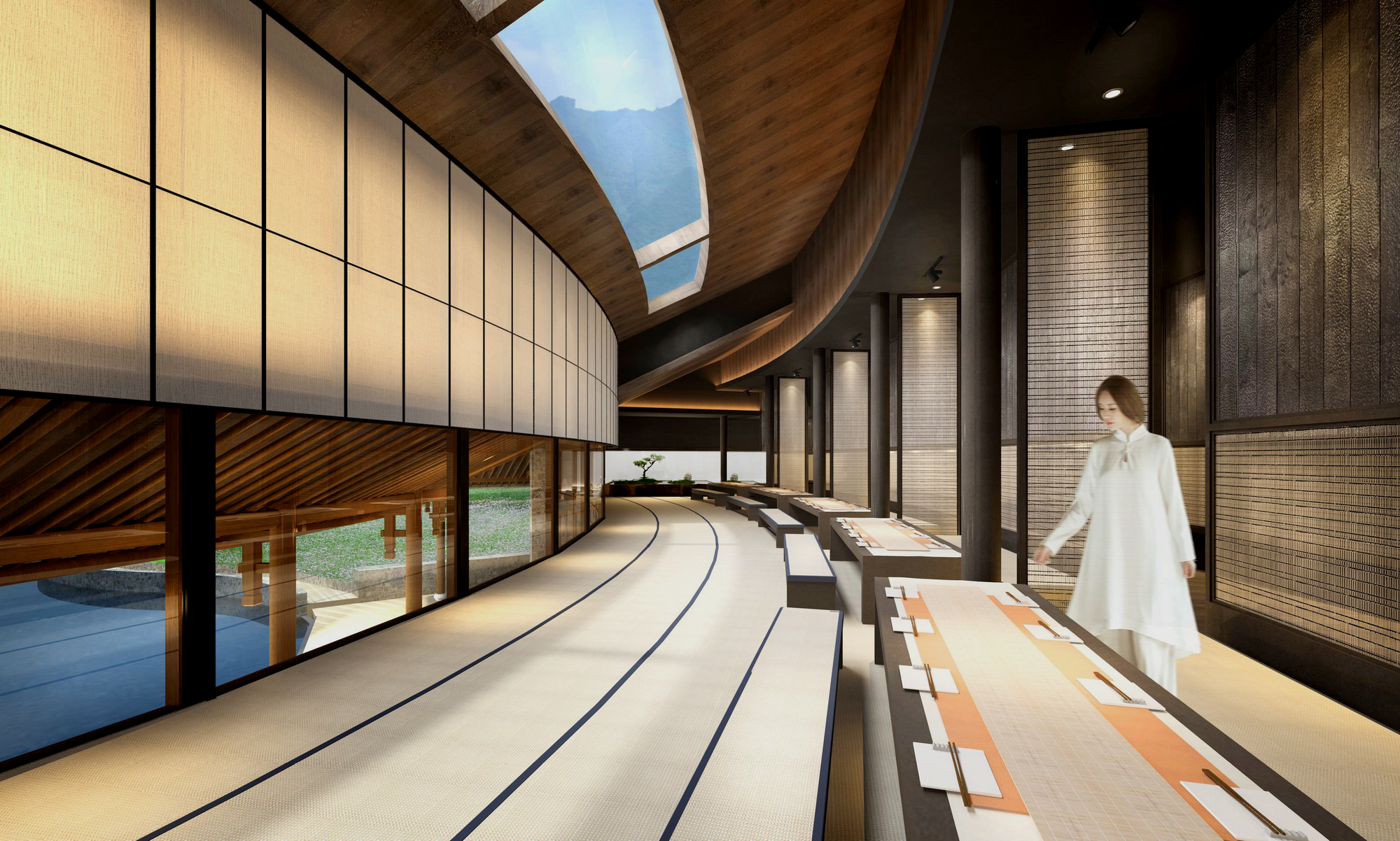 大堂区的茅草屋上洒满花籽,一到季节便会开满鲜花,形成天然的屋顶草坪。无边泳池与静水像一幅巨大的镜面映照着高山。 ![]() 松柏配合庭院式的建筑水景,从建筑外部就营造出让人放松的视觉观感。当夜幕降临,就会有穿着汉服的员工缓缓走来,将廊灯里的蜡烛一个又一个的点上。 借助梯田的地势,院子打破了常规。一座座观景客房全是独门独院,既有自己的私密性,又能舒展景观视野,这样的氛围让人想起了乡间和谐的邻里。