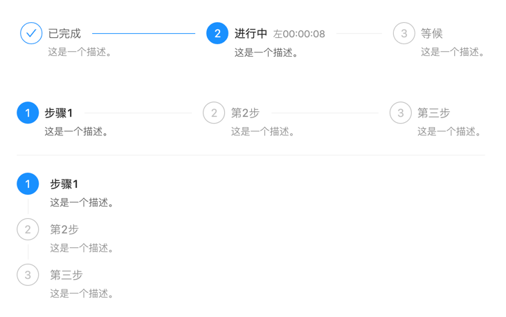 引导用户按照流程完成任务的分步导航条,可根据实际应用场景设定步骤,步骤不得少于 2 步。