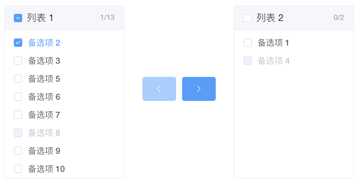 穿梭选择框用直观的方式在两栏中移动元素,完成选择行为。