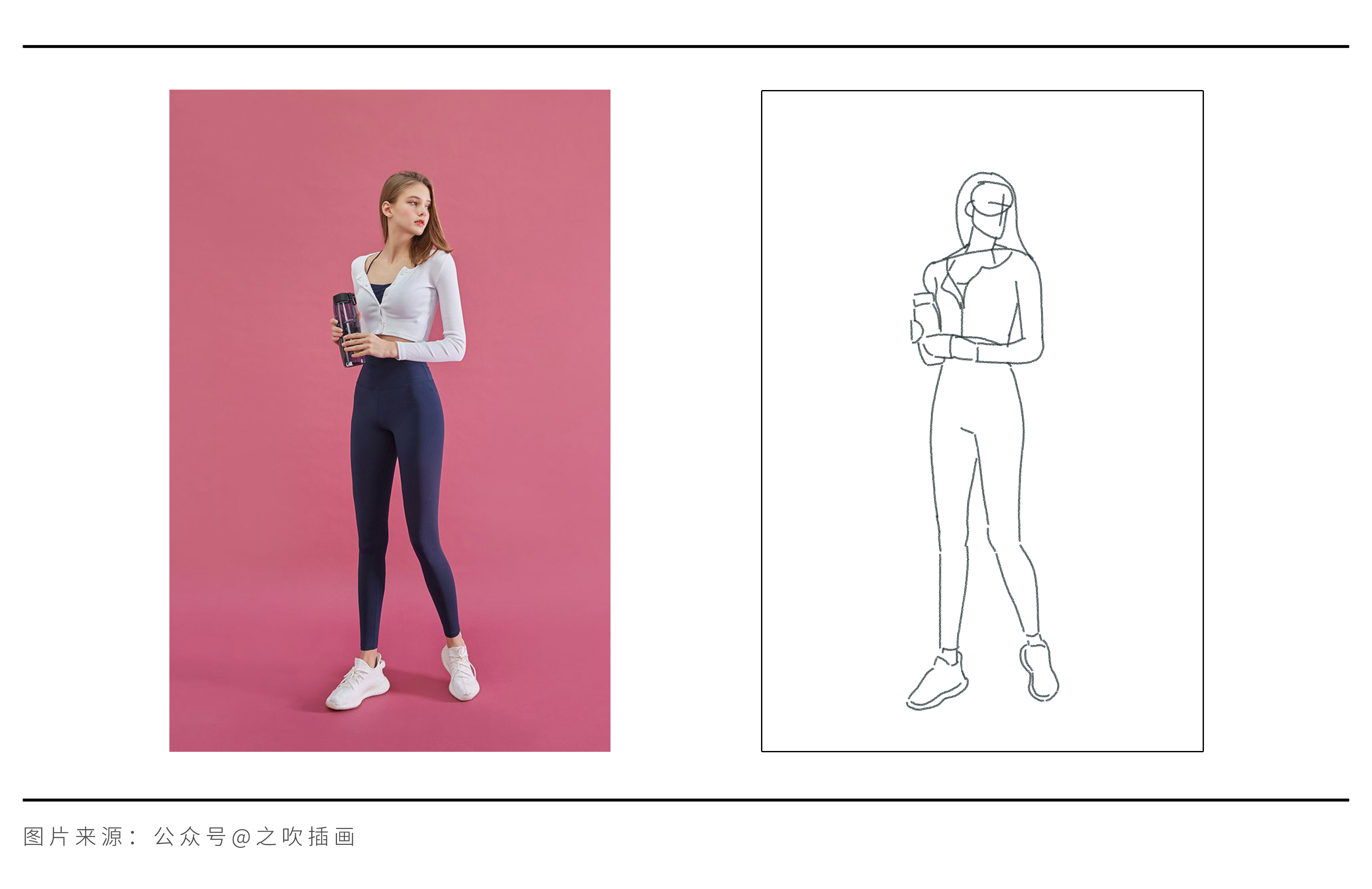 首先要找准基本的人体结构:头、胸、骨盆,同时找出动态线。然后在这个结构上,把外轮廓以简洁的线条勾画出来。怎样做到简洁:就是变化更少,线条更少,避免仔细描摹素材里的细碎轮廓,一定要概括。
