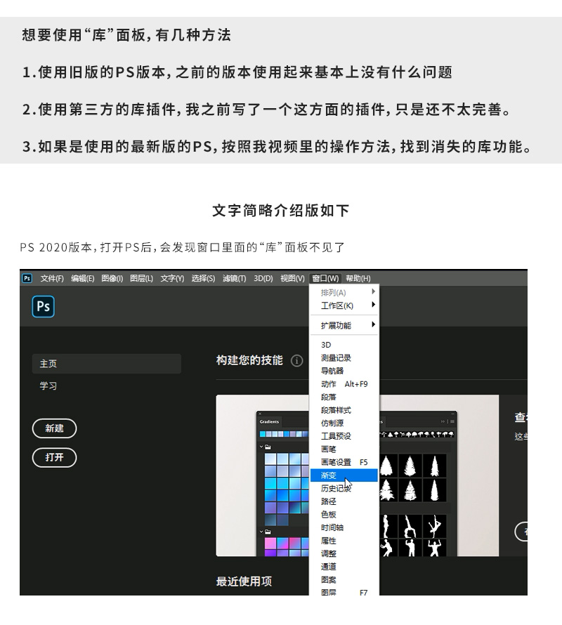 是针对最新版的PS CC2020 无法调出库面板的解决办法,如果使用的是其他的版本,就不一定会有这个问题