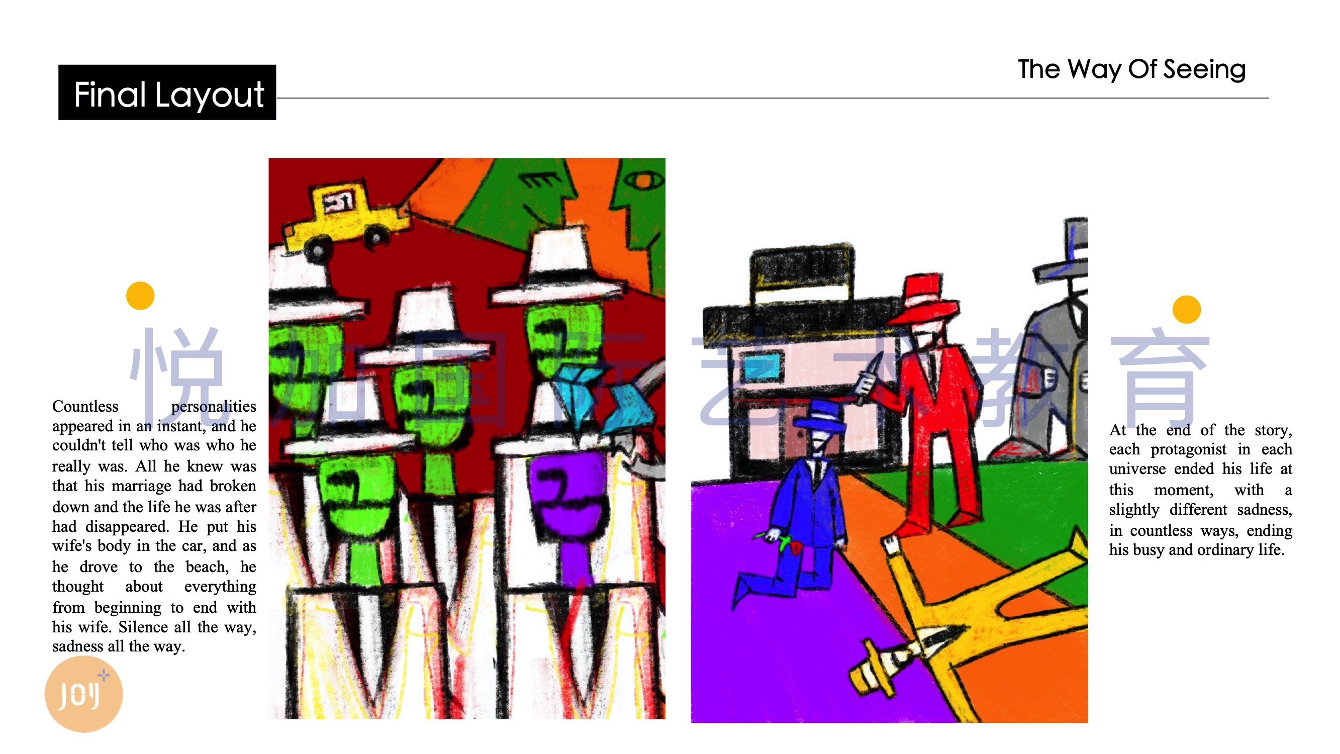 刚来到悦加时,我的画画功底很差,在做项目时没有自信,悦加的辅导老师一直鼓励我、指导我,让我逐渐对自己有了信心。老师们还提供了很多workshop的机会,让我接触到不同的艺术表达方式,这对我在画功上得到很大的提高。
