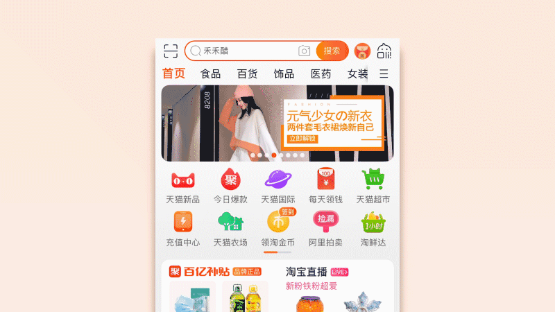 淘宝上的各类服务应用是非常多样的,除了系统推荐外,用户可以在进入一个服务应用后,点击关注,该服务就会出现在首页的金刚区里。因此淘宝将金刚区原先固定的位置改良为左滑的形式,将有限的金刚区拓展开,良好的避免了用户自选应用被挤的情况。