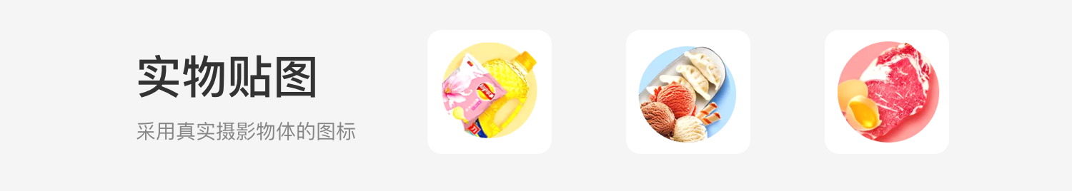 和拟物风格相似,但实物贴图图标更加直接地采用真实的摄影作品。一般常用于电商和超市、生鲜类产品。