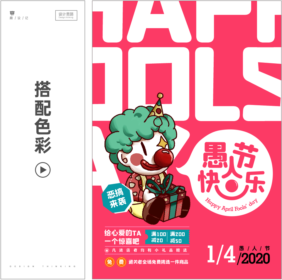 提取免费做符号化,增加信息层次对比,2020.4.1与愚人节进行大小编排,同时字形选用副标题字形。