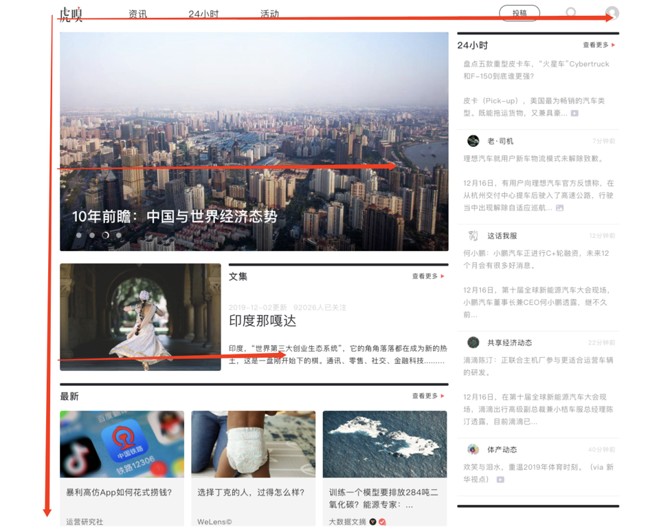 6、网站的布局设计,也会参看8/2法则,例如虎嗅网是F式布局的范例,虎嗅网的LOGO在左上角,从左至右为顶部导航+投稿+搜索+登录/注册,左侧由上至下为咨询信息,左图右文,上图下文。品牌LOGO、功能导航、资讯内容等主要信息放置于页面左侧20%的区域内。