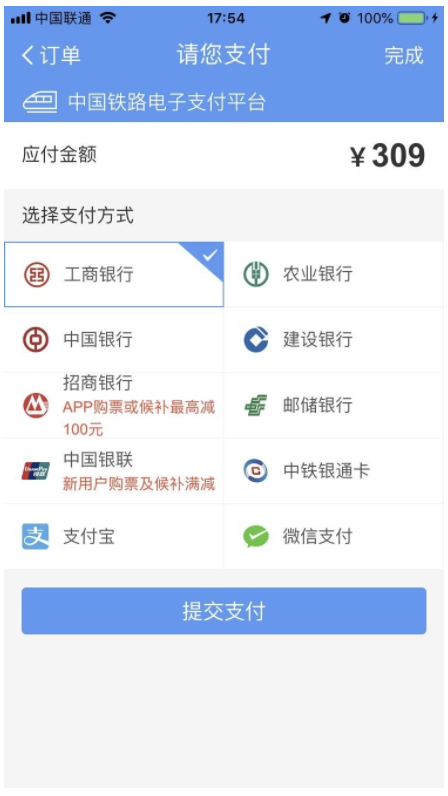 2、某款购买火车票APP,在支付订单页,将能提供的支付方式,全部无差别的堆放在页面中,供用户选择, 并且还默认选中一项移动支付占比非常小的默认项,这种设计方案,降低了用户的支付效率和支付体验,如果运用8/2法则,则可以将此页优化为默认提供微信、支付宝支付方式,将剩余其他支付方式收起在展开按钮中,并且在提供的两种支付方式中,默认选中一项,并且默认选中项可以和支付平台提供方进行合作,增加相关推广收益。