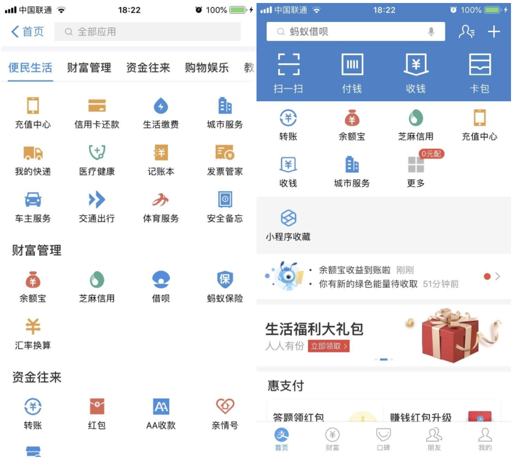 4、支付宝作为一款金融类产品,功能强大(如左图所示),服务覆盖衣、食、住、行各个方面,但是在APP的首页,只默认展示几项常用功能入口,并且为用户提供自定义设置入口的功能,这样的设计方案,可以有效的提升用户的操作效率和用户体验。
