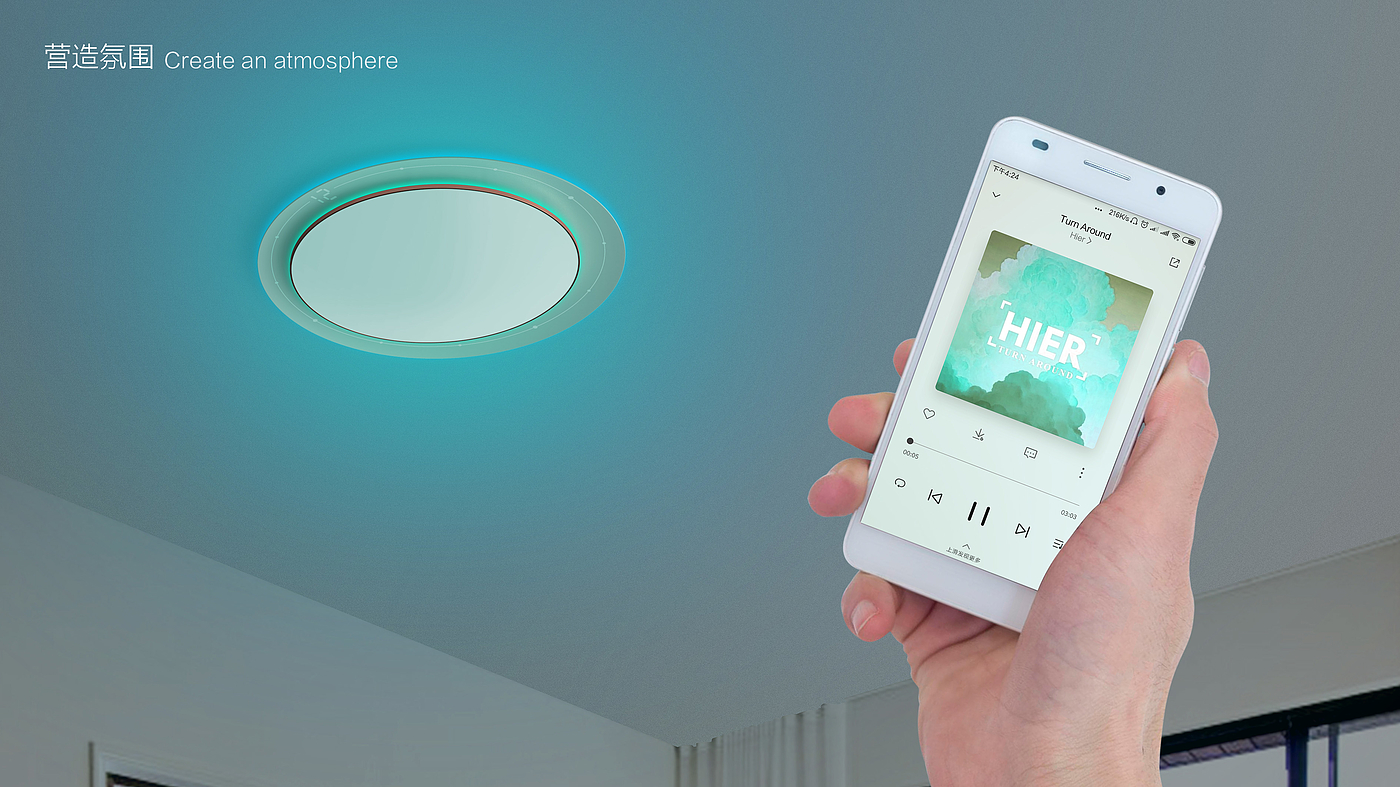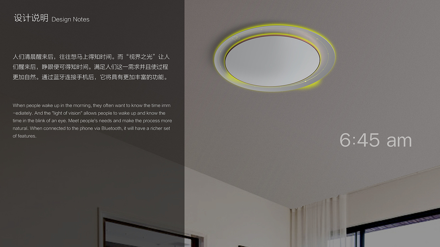 “视界之光”时间顶灯的想法起点正是发现了一个潜在需求——我们醒来后首先关心的问题是时间,在发现这个需求后,又自然的联系到卧室天花板上的顶灯,它完美的融入环境,以至于我们忘记每天早晨睁开眼睛最容易看到的就是它。