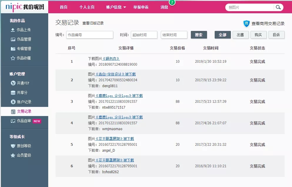 另外就是自己创作作品挂在素材网站上面去卖,比如昵图网、站酷海洛、汇图网等等。这是我的昵图号,刚毕业时传过一些,有人看上了就会下单买。