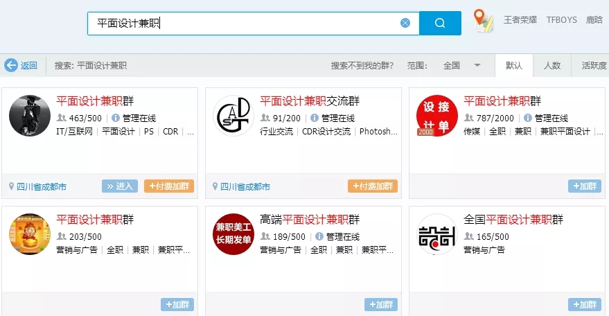 打开qq搜索与接单、兼职有关的关键词,然后加群。qq群里其实淘宝卖家挺多的,和①类似,只是也会有一些甲方或其他设计师分单子。