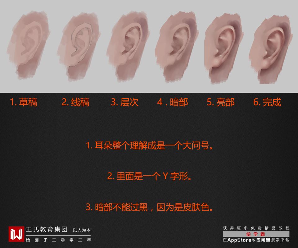 人的耳朵处于眉心线与鼻底线之间,整体形状像问号,然后加上里面的一个Y字型结构。这是一般正常人的比例,非人类的耳朵暂且不论,耳朵部分也是经常被大家忽略的一部分,千万不要忘了画。