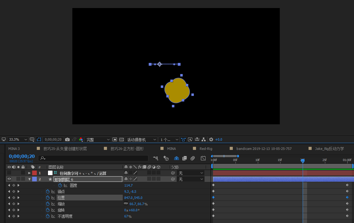效果:动画做的久了、需要养成一个习惯,就是通过数字运算来调节动画,可以保证动画的严谨,而且通过数学运算来调节动画的各种属性也可以节省大量的时间,不需要一点一点的去对细节。
