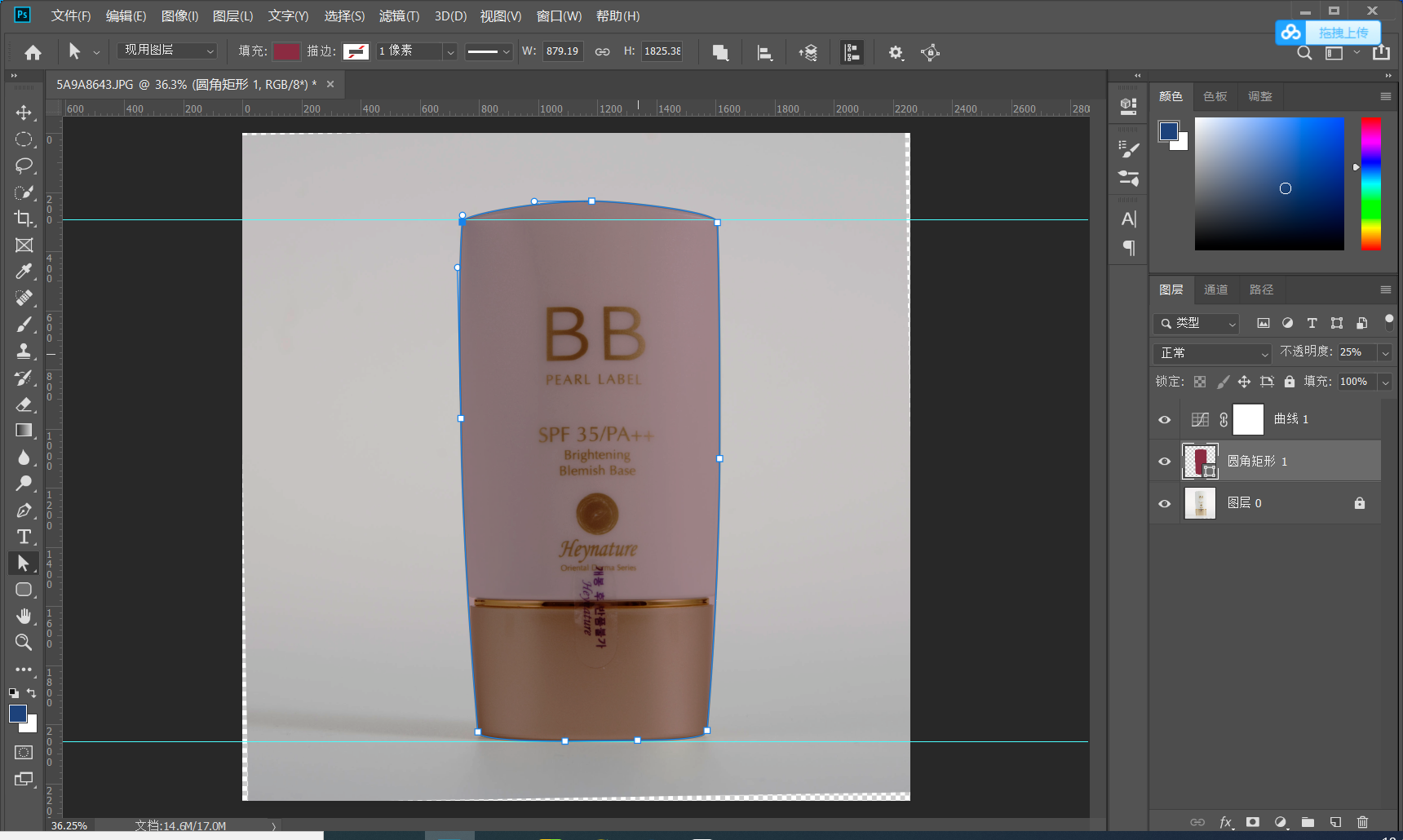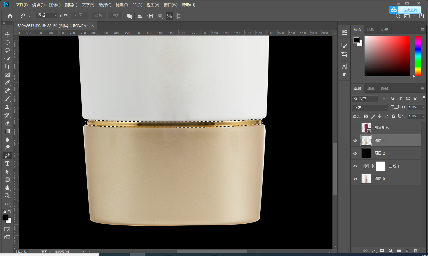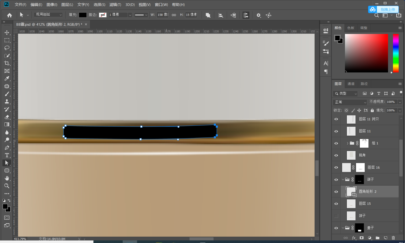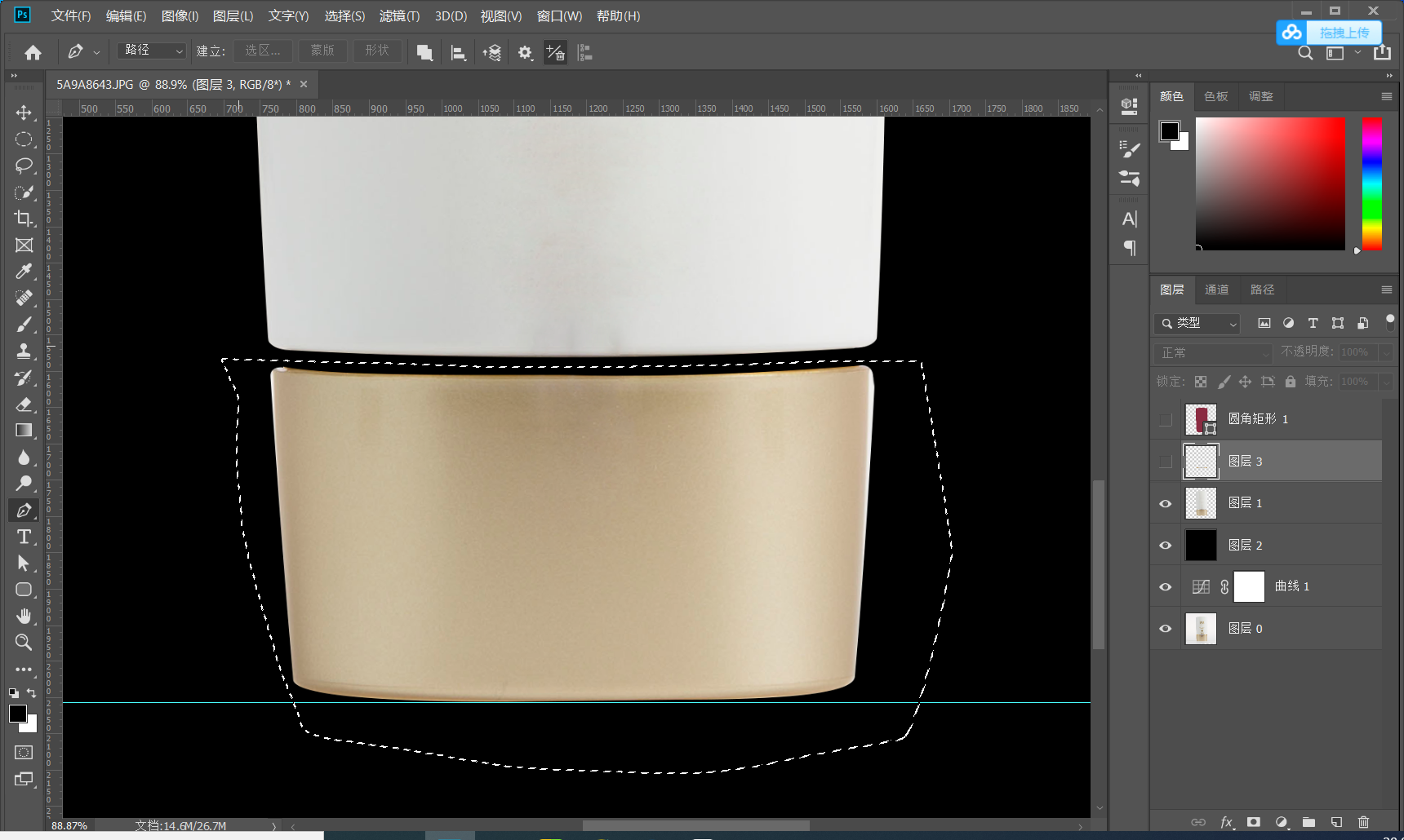 塑型;首先打开PS吧 通过绘图工具对产品的外形进行抠图,在抠图是建议用圆角矩形进行基本的抠图,当然也可以用钢笔-本人觉得钢笔的话对手柄的控制不太好操作 所以优选绘图工具 用基本型去绘制会更好 U 钢笔工具P