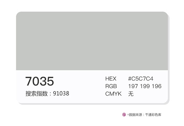 浅灰色明度高,彩度低,色彩浅淡给人很轻柔温和的感觉。受中性文化影响,属于“中性色”的灰色常被用来表现沉稳、无明显性别的一面。7035浅灰色是德国RAL色卡中的经典色彩,在油漆涂料行业中应用颇为广泛,不少装修墙面喜欢用淡淡的浅灰色系,空间明亮温馨,各种质感的家具灯具搭配自然,清新的花艺精致又文艺,充满了简约干净的生活气息。