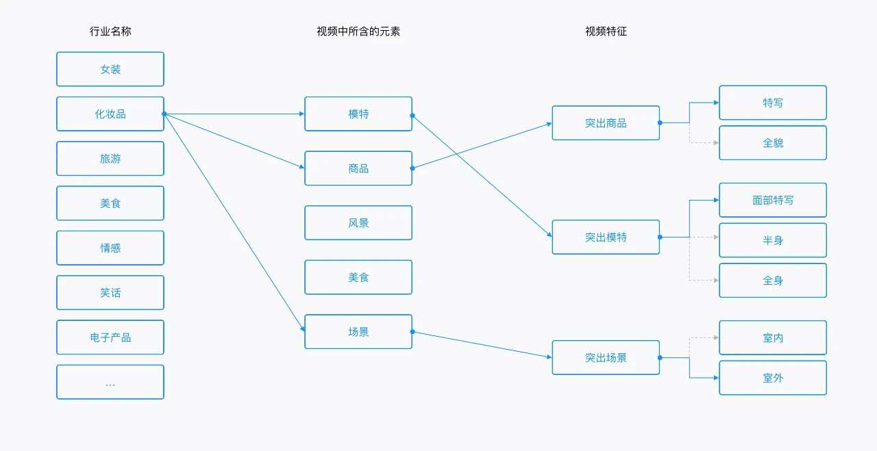 通过大数据的收集,会发现受欢迎的视频都有些共同的因素,于是,可以抽象出这些因素,得出中间这一列“视频中的元素”;接着可以细分到每个行业,看每个行业的区别点是什么,然后统计出每个行业点击率高的视频的特征。