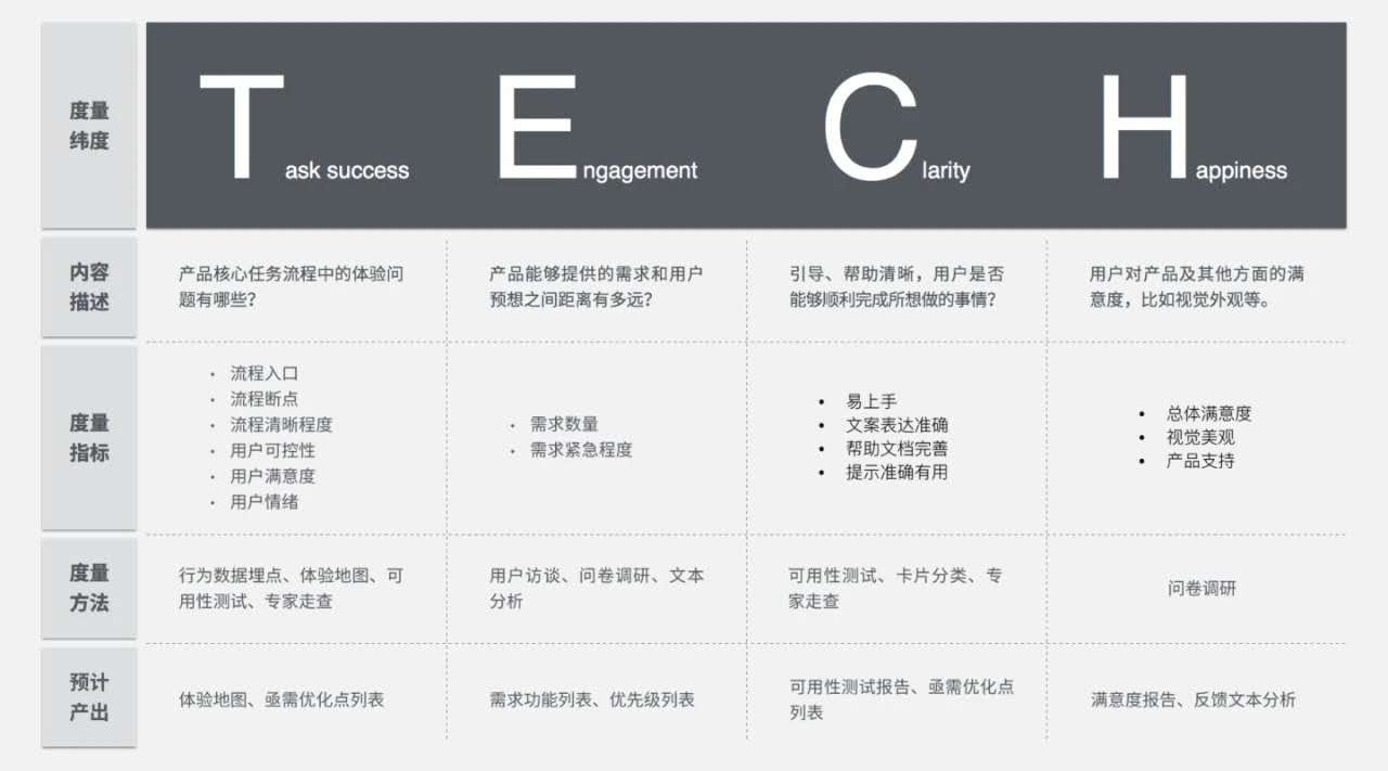 而TECH也是基于 HEART 模型,结合企业级产品体验度量实践修正后的度量体系。