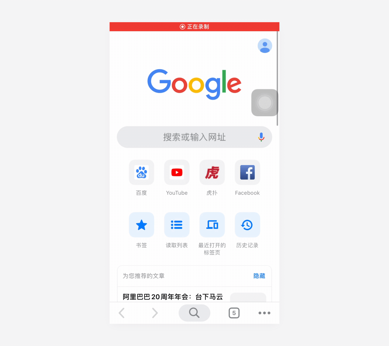 iPhone版Chrome,页面下拉时可同时左右滑动,选择关闭、刷新、打开新窗口三个操作。整个过程交互动效很流畅,操作愉悦感很强。