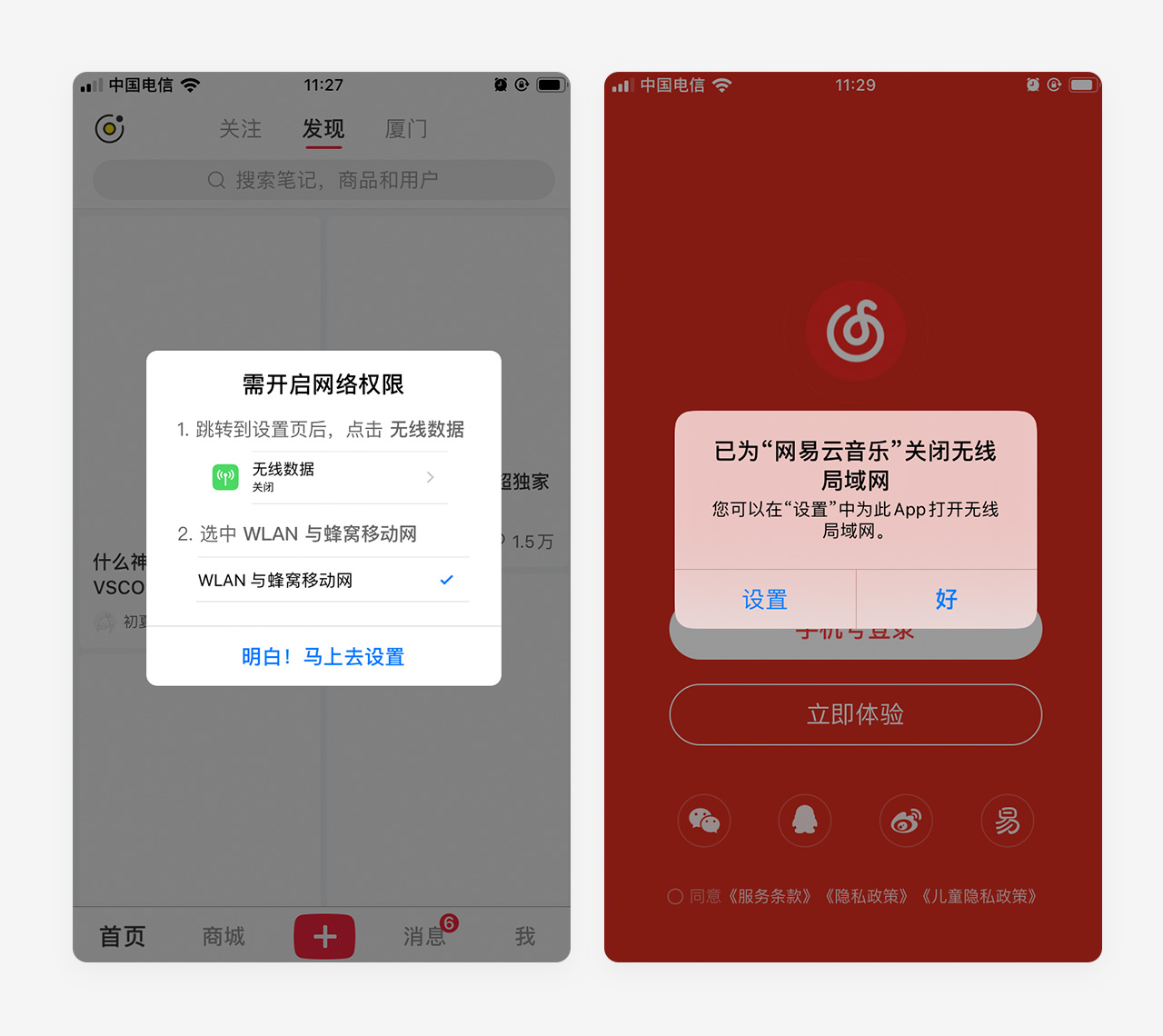 在关闭手机流量后,各大APP的处理方式是这样的如右图所示,这种方式存在缺陷,用户点击“设置”>“蜂窝网络”>找到APP>打开开关,可见操作路径之长,而且用户要是点击不好,直接关闭弹窗,需要退出APP,重新打开手机设置,更不方便,路径更长。右图小红书这种处理方式很贴心,操作路径也短,真正解决了用户痛点。