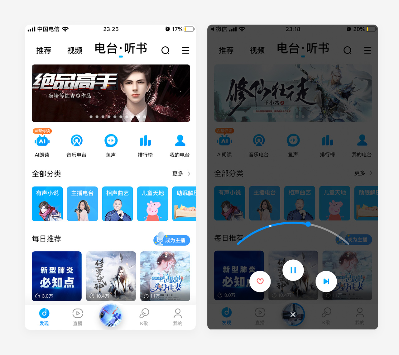 酷狗音乐,单击tab上中间音乐播放按钮进入歌曲详情页,长按tab上中间音乐播放按钮会弹出四个常用的快捷操作功能键,收藏、播放暂停以及切歌,拖动滑杆调节音乐播放进度,算是比较新颖的交互方式。