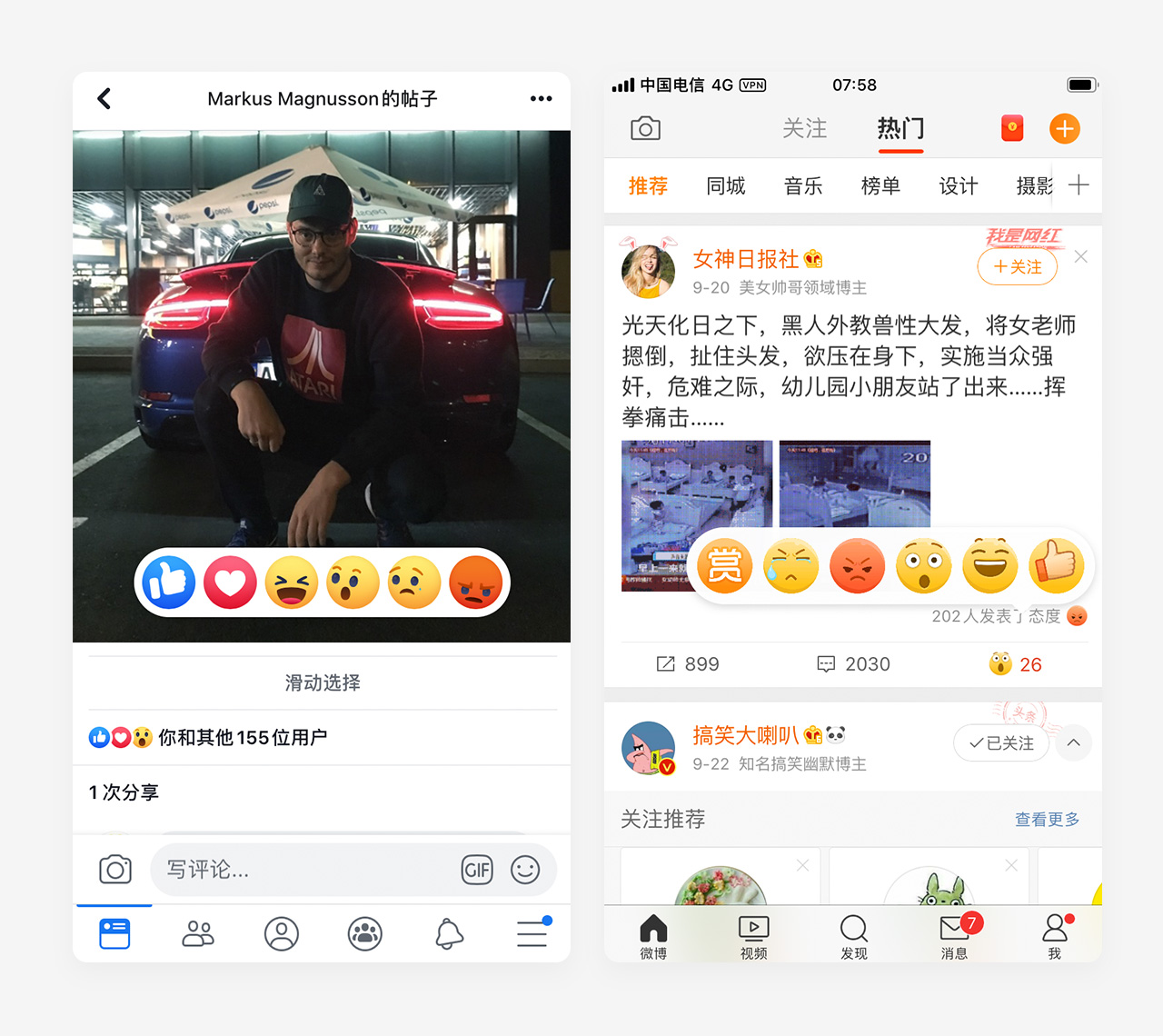 微博,Facebook 的点赞长按会出现小彩蛋,长按出现各种小表情,比起正常的点击高亮,增加用户情绪态度的表达,打破常规,提高用户注意力,并产生共鸣。