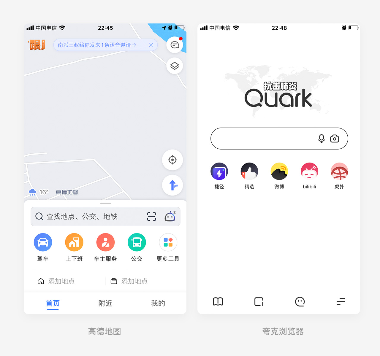 高德地图,夸克浏览器操作重心下移,更好地适应了如今大屏、全面屏的手机硬件趋势,可以帮助用户减少手势变换,也是“为拇指而设计” 的体现。