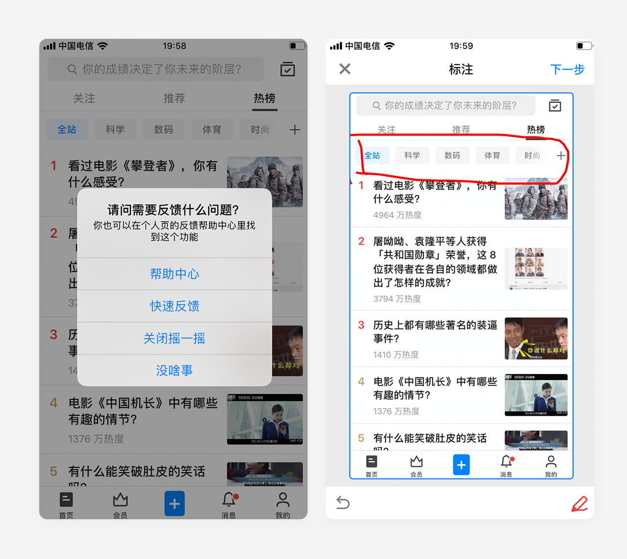 通过摇晃手机可以在任何页面呼出反馈页面,这个功能算是隐藏的比较深了,但是如果发现了就是惊喜,也提高了操作的效率。点击快速反馈,会截取当前页面,同时可以对截图进行标志,缩短了用户反馈操作路径,非常好的体验设计细节!