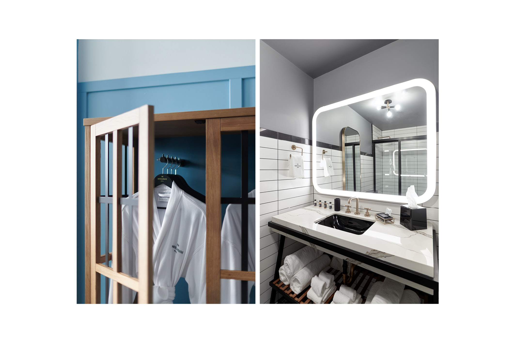 萨里宁(Saarinen)设计的精选诺尔(Knoll)家具,马提尼酒吧,老式旋转电话和带有好莱坞风格梳妆台这些设计元素使得酒店充满了六十年代风格。客房拥有清脆的白色调色板,并以暖胡桃木元素和拉丝黄铜作点缀。参照了世纪中叶的设计设计师在室内放置了定制家具和照明设备(例如木质饰边)沿着天花板边缘延伸,柔和地照亮了房间。