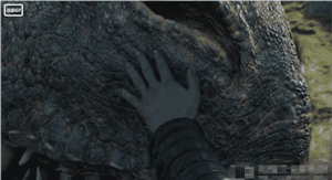 第一阶段,雪诺的手还未接触到龙前:我调慢了GIF图,大家可以观察到,此时龙的牙齿是全部暴露在嘴唇外面的,这就向观众暗示了这头龙在此时极具攻击性,随时都有可能一口咬上去。而在观众收到“具有攻击性”这个信息之后,动画师紧接着又做了第二轮暗示。从画面中我们可以看到龙微微的往前挪动了一下,这个挪动的速度很快、幅度微小,但是这个细节已经将另外一个信息传达给观众了,那就是坐实第一个暗示——这条龙不仅是最具攻击性的野兽,而且性情冲动难以驯服。