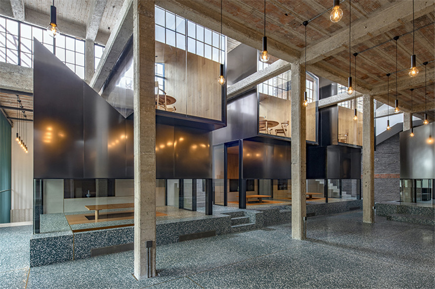Tingtai Teahouse 位于上海莫干山路艺术区的一处原厂房和美术馆中。茶馆坐落在绿色的水磨石景观,内部装饰着熏制的橡木营造出简单而温暖的气氛,同时玻璃水平面的高度为茶馆内部的视线提供了私密性。