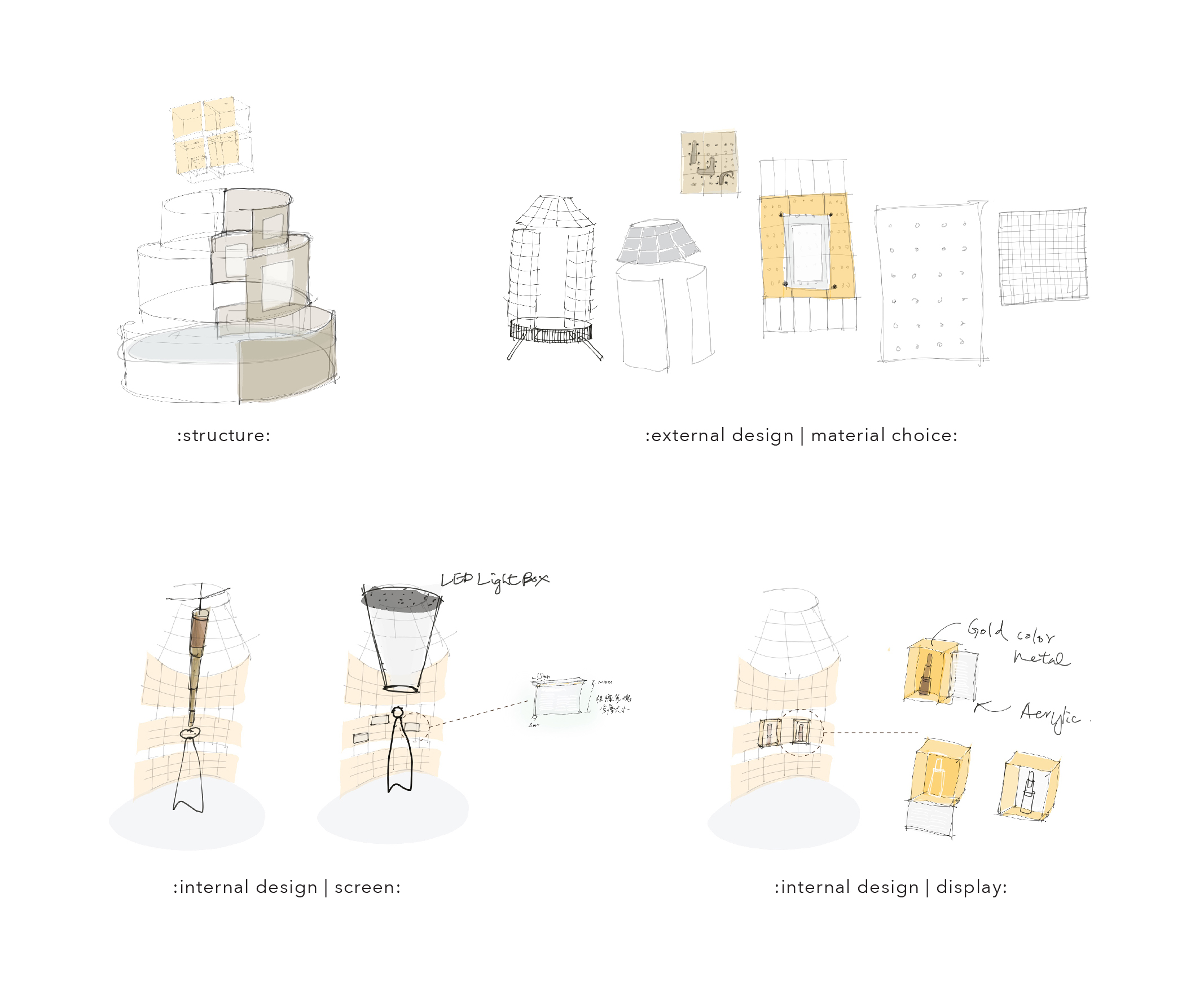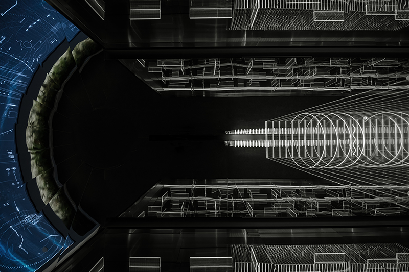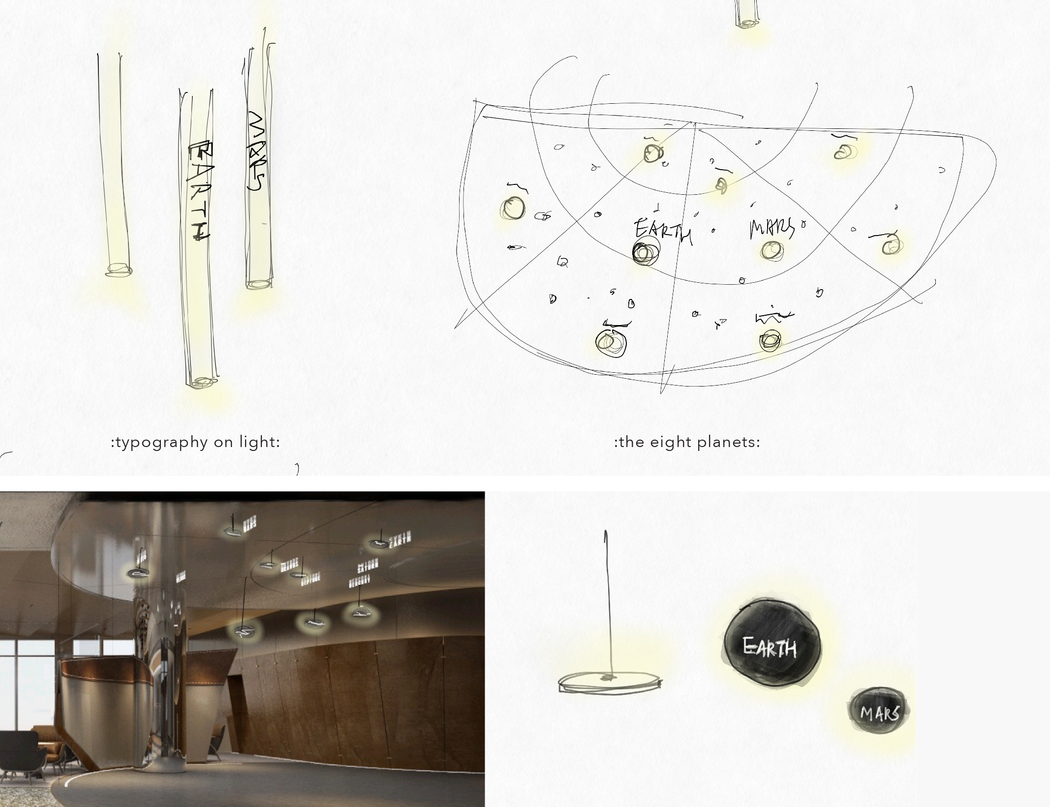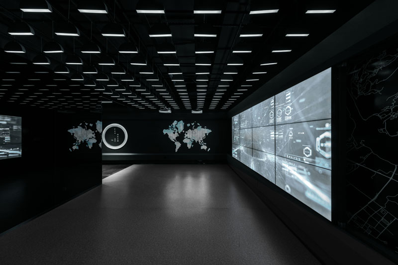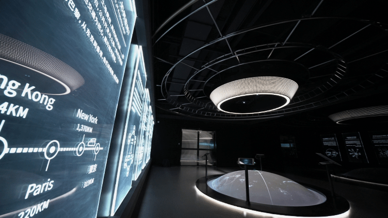 进出口电梯停留的通道,是时空转换的前场,以LED屏幕循环播放抽象概念动画,隐喻空间探索的基调。