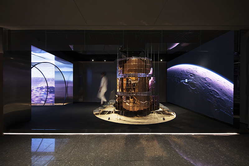 副入口结合空间主题造型装置,模拟的是人类“登月”的一个旅程,结合LED荧幕影像带来的神秘感,表现的正是人类探索未知的无限勇气。