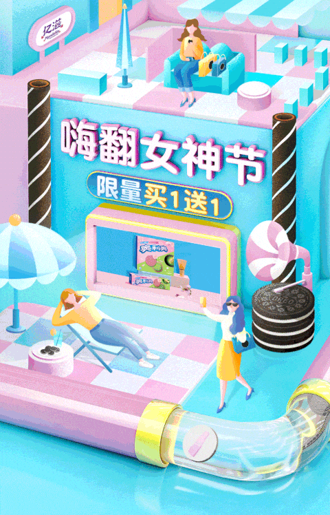 2.建立一个大的场景,场景中的建筑与奥利奥的产品结合,构造一个富有趣味性的场景,在这个基础上设计一些小的微景观场景,例如:闺蜜下午茶、自拍逛街等小资生活。画面整个相对比较保守,不容易出错。